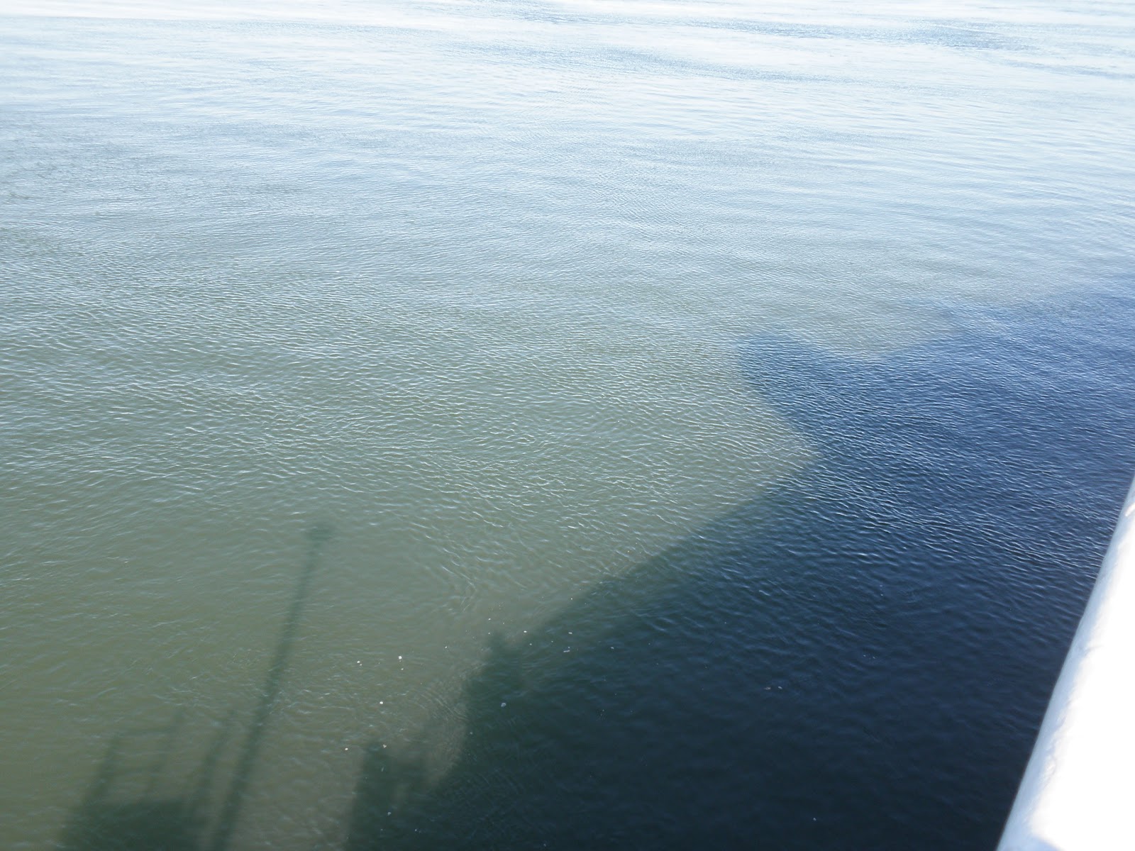 | Shadow of the Queen of Nanaimo while docked at Galiano. The shadows of two people can be seen on the foredeck. I'm the one on the right. |